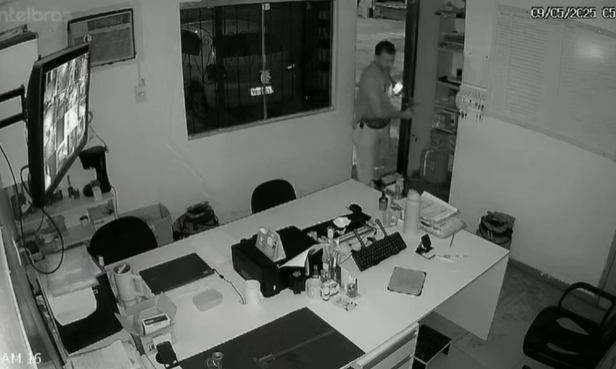 Por volta das 5h11, as imagens mostram o escritório vazio quando o homem entra para usar o banheiro. Pouco depois, uma funcionária chega ao local e, ao se trocar, percebe o aparelho camuflado no chão. Ao verificar, ela constatou que o dispositivo estava gravando e acionou imediatamente a empresa.