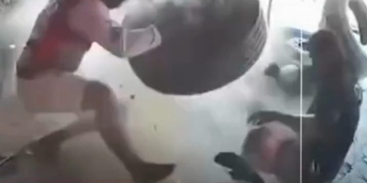 A imagem foi captada pela câmera de segurança do estabelecimento, e mostra o momento do papoco. Os dois foram jogados para trás com a força da explosão.