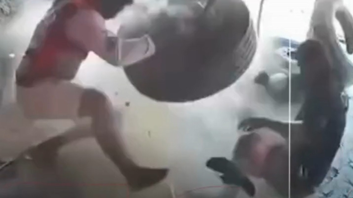 BRASIL – Um pneu estourou durante trabalhos na oficina que fica em Reriutaba, no Ceará, enquanto dois mecânicos faziam o serviço de encher o pneu no local.
