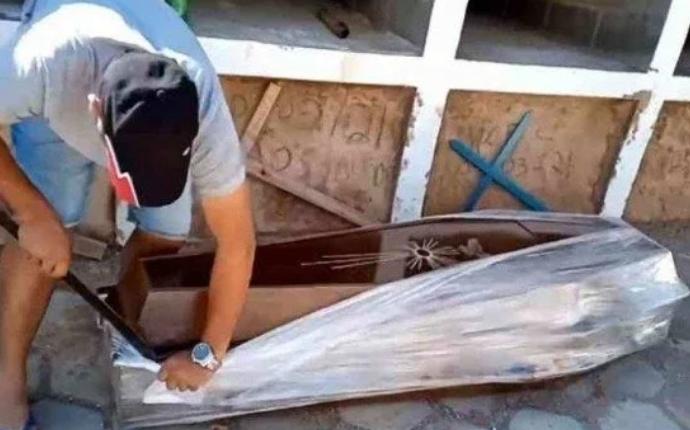 O plástico que cobria a urna foi retirado com um facão e, na sequência, a tampa também foi aberta pelo vereador. Toda ação foi realizada sem a utilização de luvas ou outro equipamento de proteção. Wiliam estava apenas de máscara. “Não tem nenhuma flor. Falta de respeito com o cidadão. Vamos abrir a tampa. Vê se tem Covid aí”.