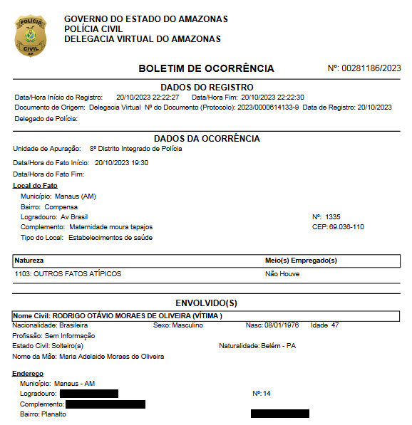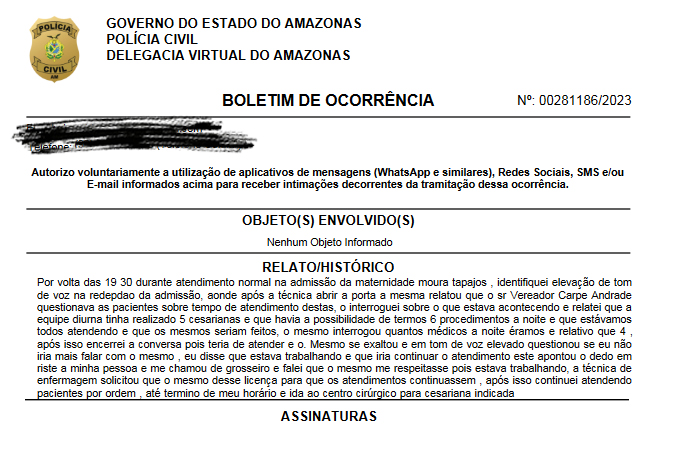 MANAUS (AM) – O ginecologista Rodrigo Otávio Moraes de Oliveira, da maternidade Moura Tapajós, localizada na Zona Oeste de Manaus, registrou um Boletim de Ocorrência (B.O) contra o vereador Capitão Carpê. Segundo o profissional e a equipe do hospital, o parlamentar cometeu agressão verbal e chegou tumultuando o trabalho na última sexta-feira (20).