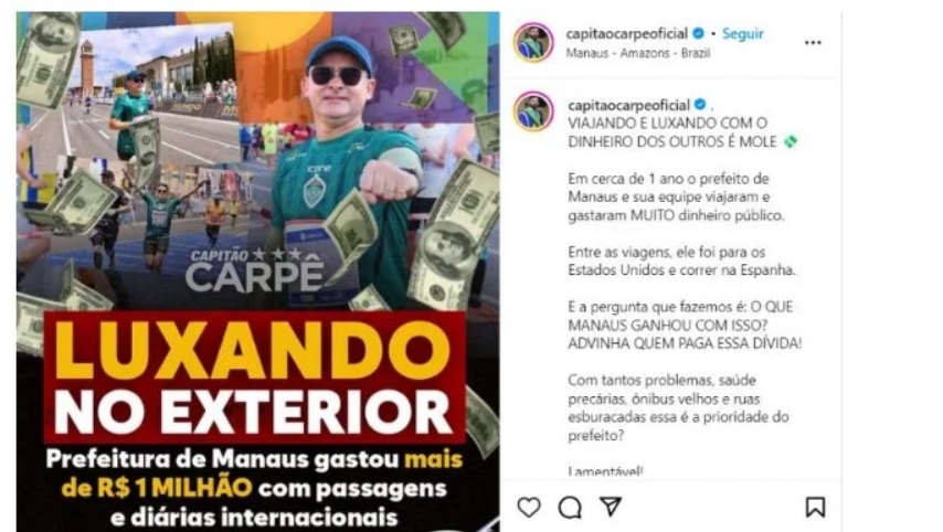 MANAUS – O vereador Capitão Carpê foi condenado a pagar uma multa de R$ 52 mil por uma montagem difamatória contra o prefeito de Manaus, David Almeida. A Justiça ainda decidiu que ele deve apagar a postagem.