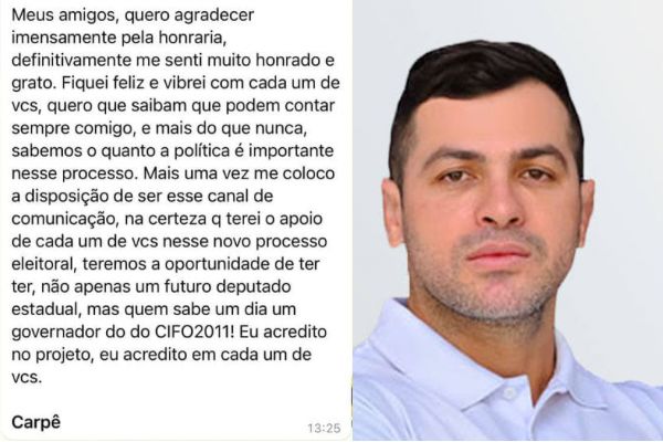 MANAUS (AM) – Eleito vereador pelo partido Republicanos, Capitão Carpê anunciou candidatura para deputado estadual. Nesta semana, prints dele pedindo apoio nas eleições de 2022 foram divulgadas. As mensagens foram enviadas por meio do aplicativo WhatsApp.