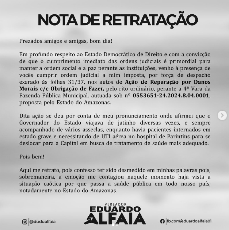 MANAUS (AM) – Após decisão judicial de ação de reparação por Danos Morais, o vereador Eduardo Alfaia (Avante) foi obrigado a postar nas redes sociais, nesta terça-feira (3), uma nota de retratação onde volta atrás com uma fake news divulgada por ele sobre o governador do Amazonas, Wilson Lima.