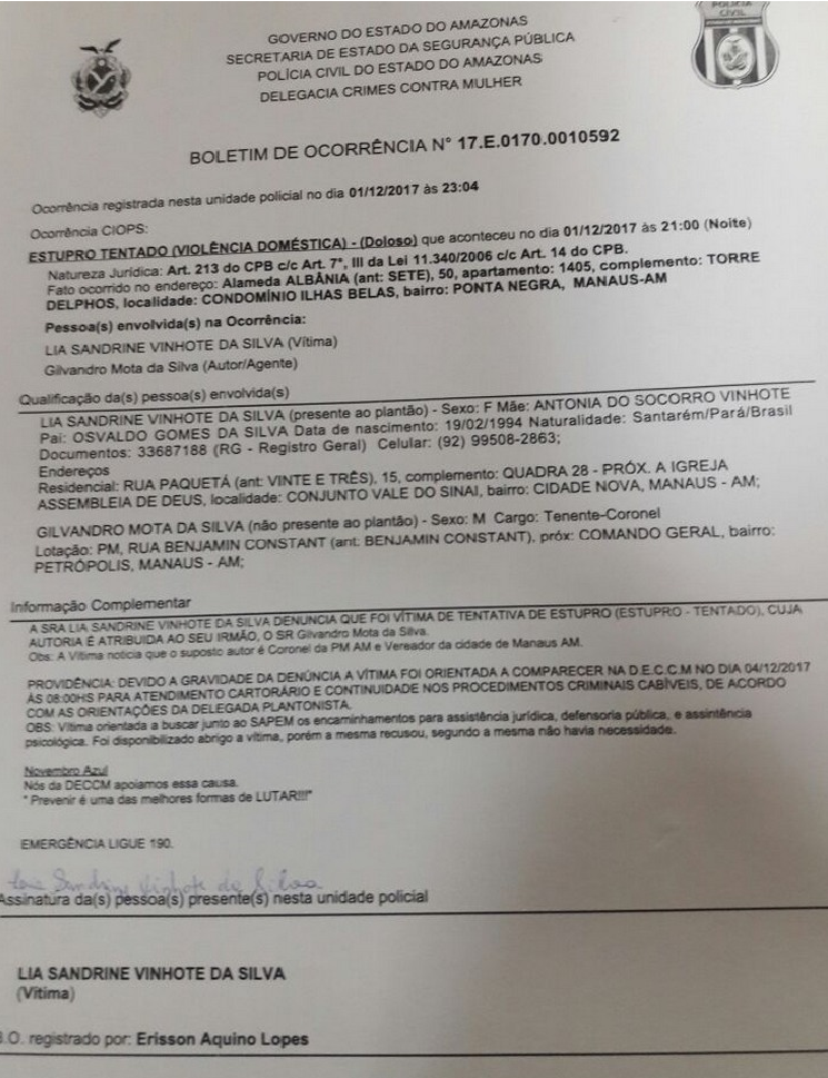 Manaus – O coronel da PM e também vereador Gilvandro Mota (PTC), foi acusado pela própria irmã, Lia Sandrine Vinhote da Silva, 23 anos, de tentativa de estupro.