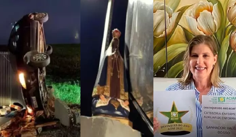 FORMOSA DO OESTE (PR) – A vereadora Valéria Bosso (PL), de Formosa do Oeste (PR), causou comoção nas redes sociais ao relatar que saiu ilesa de um acidente na madrugada do último sábado (6). O carro que ela dirigia capotou na rodovia PR-239 e parou exatamente aos pés de uma imagem de Nossa Senhora Aparecida instalada à margem da pista.