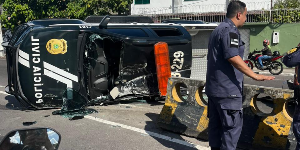 MANAUS (AM) – Um policial ficou ferido após uma viatura da Polícia Civil capotar na tarde desta segunda-feira (10), na Rua Valério Botelho Andrarde, no bairro São Francisco, na zona Centro-Sul de Manaus.