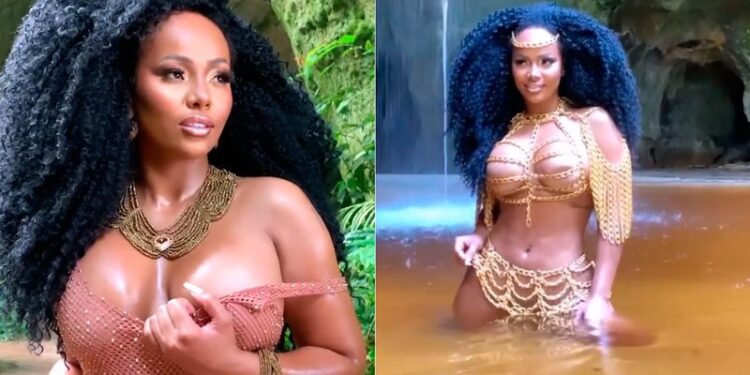 Em duas gravações, a beldade aparece em meio à natureza exibindo o corpo cheio de curvas poderoso: