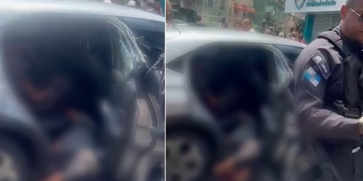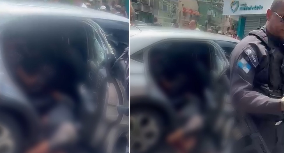 Imagens mostram os bandidos mortos dentro do carro, com fuzil, pistolas e munição. Os bandidos estariam saindo de um baile funk e cometendo arrastão nas ruas.
