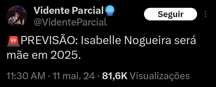 Um perfil chamado Vidente Parcial, super famoso no X (antigo Twitter), previu que Isabelle Nogueira deve ter um bebê ano que vem. A publicação foi feita no sábado (11).