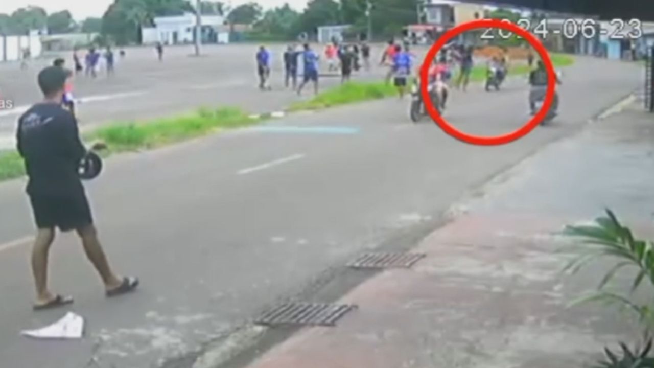 Uma câmera de segurança registrou uma mulher ‘bolando’ na rua ao cair da moto. Não há informações sobre o estado de saúde do adolescente.