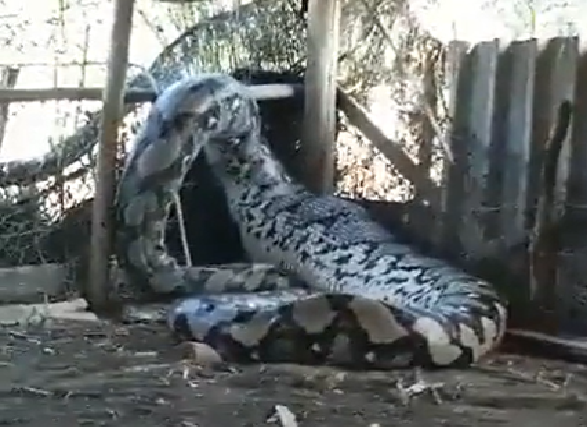 Nas imagens, ela aparece amarrada numa estrutura de madeira. O animal parece tentar se libertar e o tamanho choca, levantando a suspeita dos internautas de que o animal tivesse acabado de se alimentar.