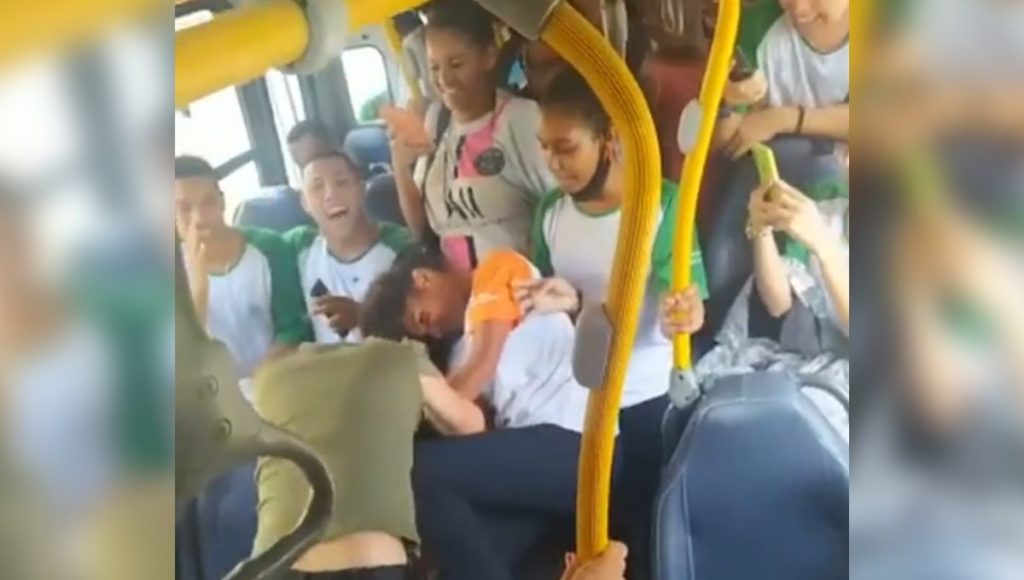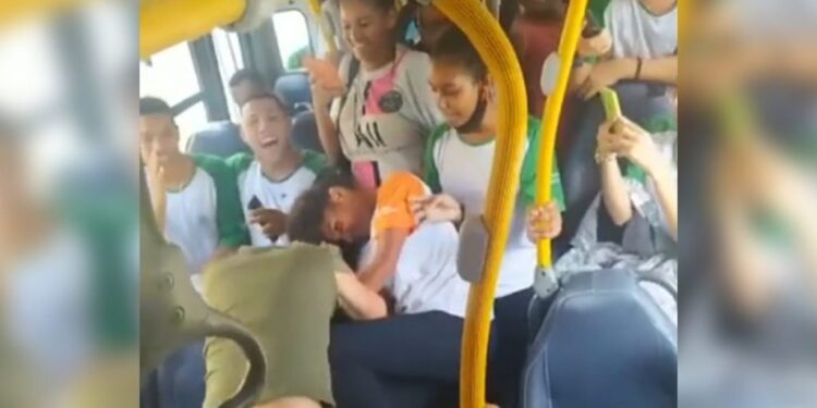 CARIACICA (ES) – Uma briga entre estudantes foi filmada dentro de um ônibus em Cariacica, no Espírito Santo. Grupos de mensagens e nas redes sociais receberam o vídeo, nesta sexta-feira (18). As alunas aparecem na maior porrada enquanto outros adolescentes incentivam o barraco entre as duas.