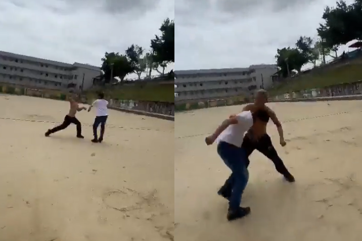 Conforme as imagens, os colegas estão em um campo e vários alunos estão ao redor gravando a briga. Um deles está sem camisa. Os dois trocam socos, chutes e a motivação seria porque ambos descobriram namorar a mesma menina.