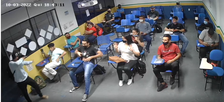 Em seguida, uma das salas com mais de dez alunos é invadida pelo assaltante. Os alunos não reagem e entregam os celulares. Alguns levantam as camisetas para mostrar que não possuem mais nenhum objeto.