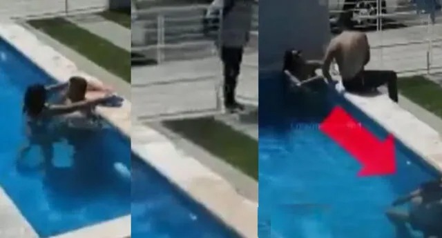 Conforme mostram as imagens virais , a esposa vê seu companheiro chegando, prestes a entrar em casa e, sem pensar, mergulha o amante na água para evitar o encontro.