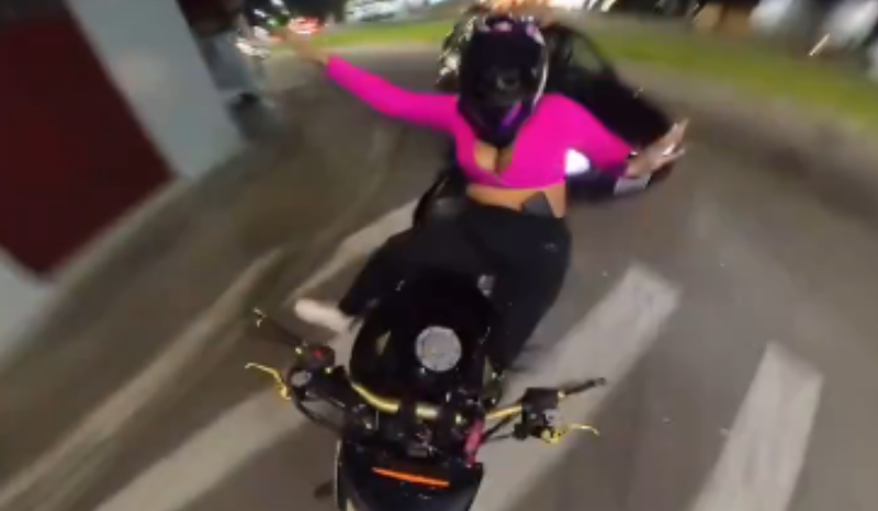 Nas imagens, ela veste uma camisa de manga longa cor de rosa e começa a conduzir a moto pela rua. De repente, perde o controle do veículo e bate na lateral dele. O fato ocorreu no Jardim Motorama.
