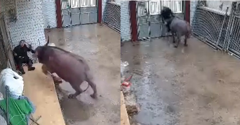 CHINA|Uma câmera de segurança registrou uma cena bizarra de um búfalo indo contra o dono de um matadouro na China. A pré-vingança aconteceu na província de Huangbei.