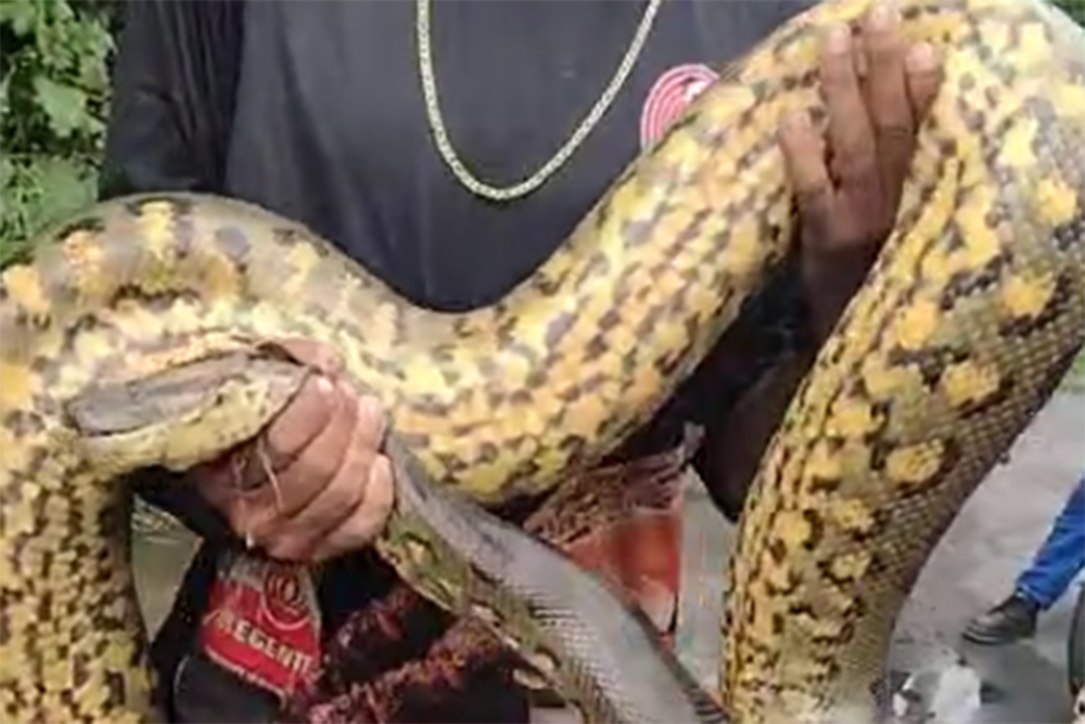Segundo a pessoa que gravou o vídeo compartilhado nas redes sociais, a cobra possui quase 3 metros de comprimento e é identificada como uma sucuri-amarela. Várias pessoas tiraram fotos e gravaram vídeos antes do resgate. Veja: