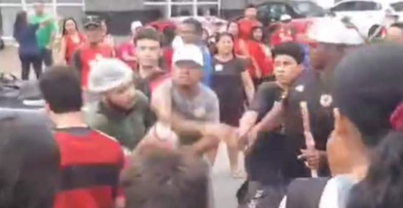 Uma das pessoas comenta que isso é um absurdo, mas o petista vai pra cima do trabalhador, que sai do meio da muvuca com medo de apanhar. As imagens mostram o grupo na calçada, impedindo que as mercadorias supostamente roubadas sejam recuperadas.