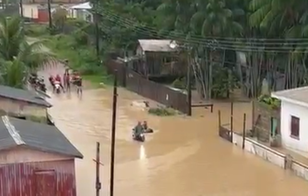 NOVO ARIPUANÃ (AM) – Um morador não identificado teve que andar de moto com uma boia após forte chuva na tarde desta sexta-feira (14) em Novo Aripuanã, no interior do Amazonas. A cena viralizou.
