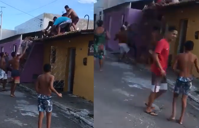 BRASIL – Um suposto assaltante não identificado foi espancado pela vizinhança e caiu de um telhado na base da “bicuda”. Um vídeo viralizou nas redes sociais nesta quinta-feira (28) e mostra a confusão, cujo local não foi identificado.