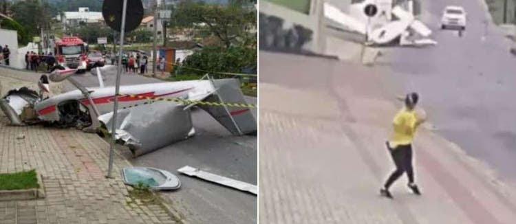 GUABIRUBA–SC| Neste sábado (25), um avião monomotor caiu no centro da cidade de Guabiruba, em Santa Catarina. Câmeras de segurança registraram o momento da queda, que por pouco não atingiu uma casa. Dois homens ficaram feridos.