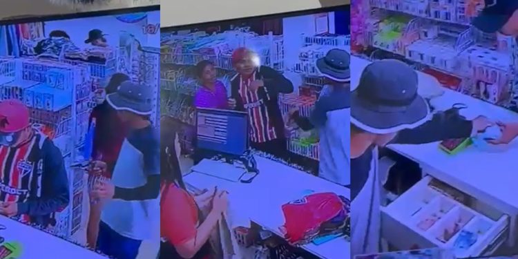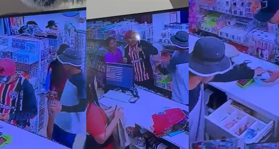 A câmera do estabelecimento mostra a abordagem violenta e o momento em que eles passam a mão no dinheiro do caixa, agredindo os funcionários e os clientes.