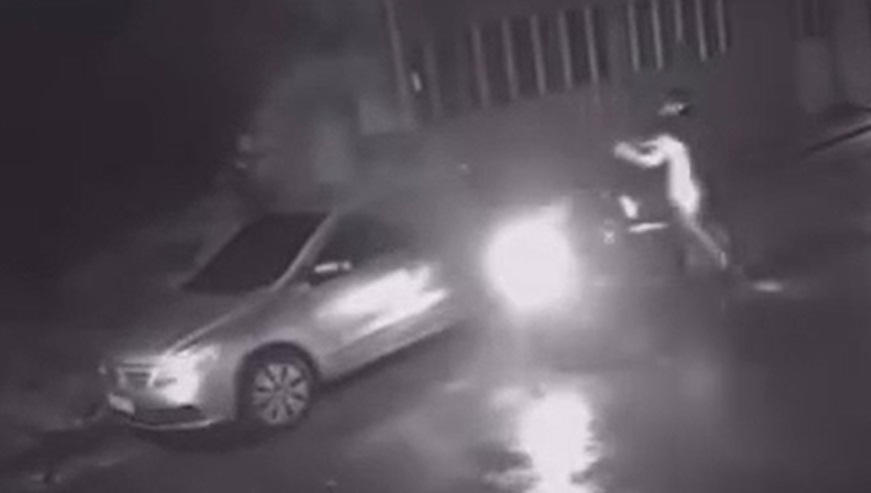 O crime foi registrado por uma câmera e mostra a dupla de bandidos acelerando a moto atrás da vítima, que corre mas acaba sem ter para onde ir.