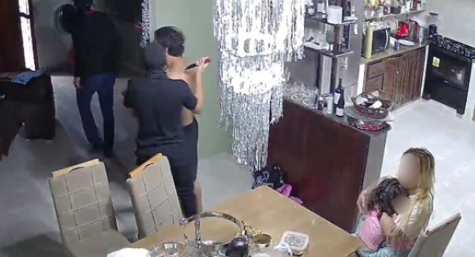 Uma imagem que circula nesta quarta-feira (7) mostra o bandido com uma faca nas costa do empresário, diante de uma mulher e de uma criança. Ao todo eram três criminosos dentro da residência.