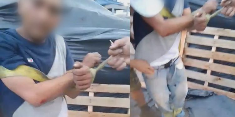 No vídeo compartilhado em grupos de WhatsApp, o acusado aparece com as mãos e pés amarrados. “Esse aqui que estava lá dentro”, diz o rapaz que registra a imagem.