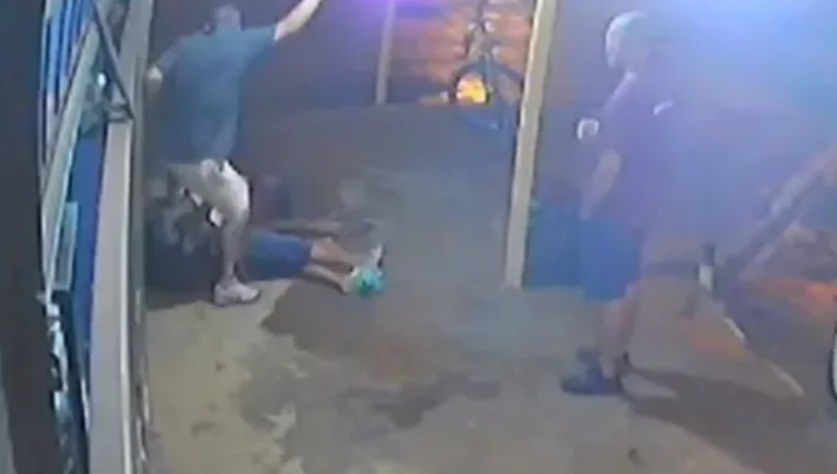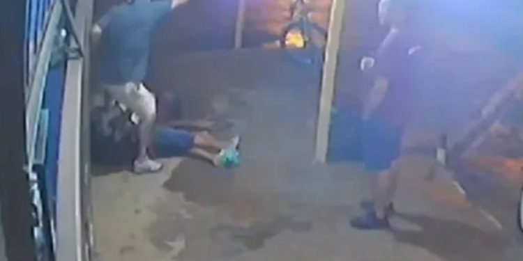 BRASIL – Um homem com tornozeleira eletrônica e não identificado foi flagrado pisando a cabeça de um idoso neste domingo (27), na calçada de uma distribuidora.