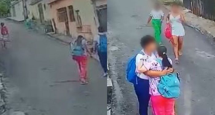 O crime foi registrado por uma câmera de segurança. Uma mulher caminha com uma criança a caminho da escola. Mais atrás, outras duas também andam na via.