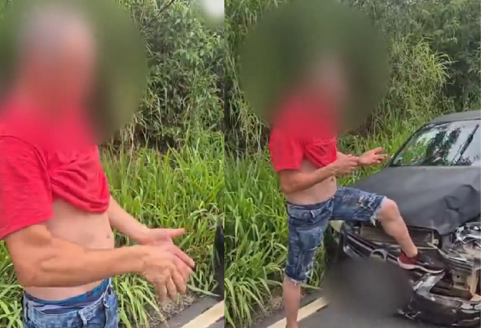 Nas imagens, o carro que o “bebum” dirigia aparece com a frente completamente destruída. Ele está do lado de fora, levanta a blusa e gesticula como se tivesse um objeto na mão esquerda.