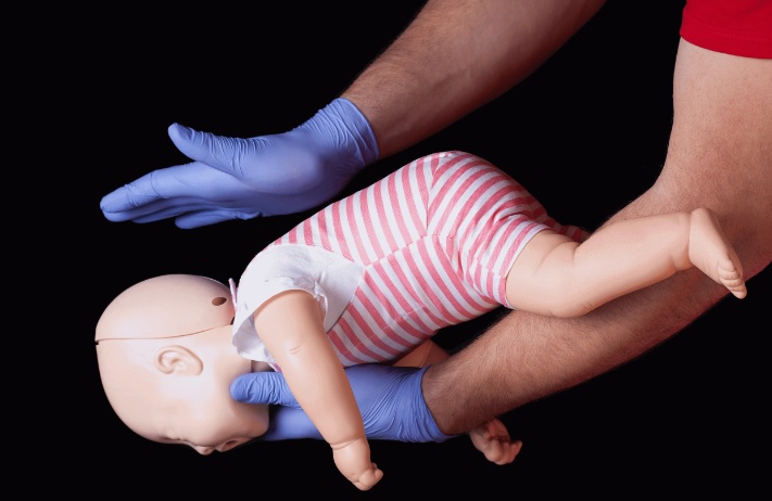 Coloque o bebê de bruços em cima do seu braço e faça cinco compressões entre as escápulas (no meio das costas). Vire o bebê de barriga para cima em seu braço e efetue mais cinco compressões sobre o esterno (osso que divide o peito ao meio), na altura dos mamilos. Tente visualizar o corpo estranho e retirá-lo da boca delicadamente. Se não conseguir, repita as compressões até a chegada a um serviço de emergência (pronto socorro ou hospital). Esses procedimentos são válidos somente se a criança ou o adulto engasgado estiverem conscientes. Vítimas inconscientes precisam de atendimento hospitalar rapidamente. Os primeiros socorros para asfixia ou engasgo devem ser tomados até que seja possível o atendimento especializado.