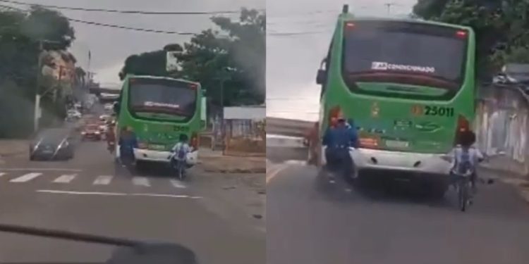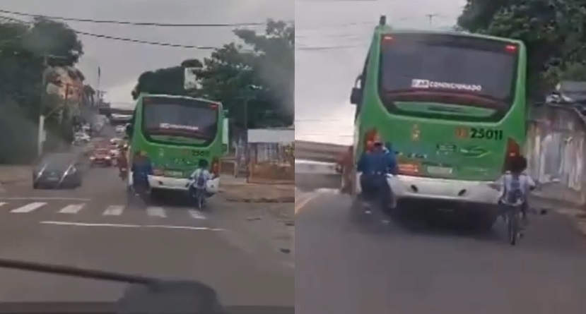 MANAUS– A cena da carona que brinca com a morte se repetiu em Manaus. Dessa vez na Avenida Desembargador João Machado, a popular Estrada dos Franceses, no bairro Alvorada, zona Oeste de cidade. Dois jovens se penduraram na traseira do ônibus.