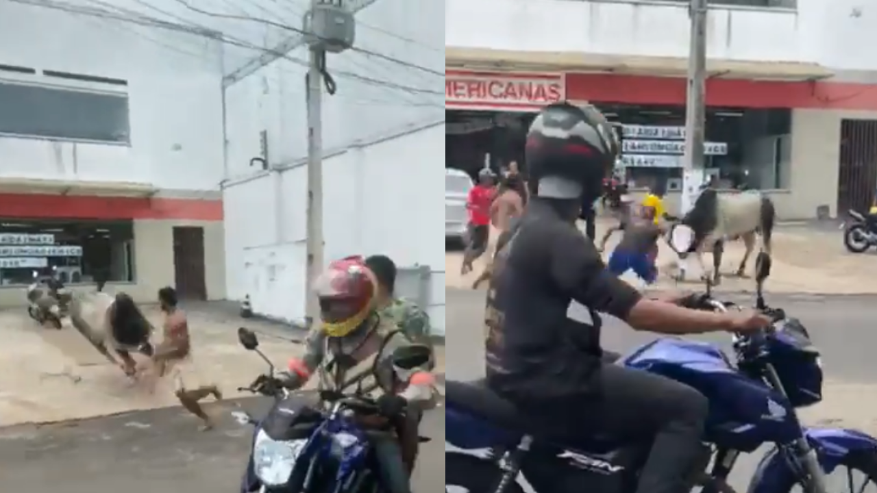 Aí a confusão foi generalizada, era mototaxista quase levando chifrada, gente buzinho e deixando o bicho nervoso, e um aprendiz de Cowboy que tenta laçar o fujão.