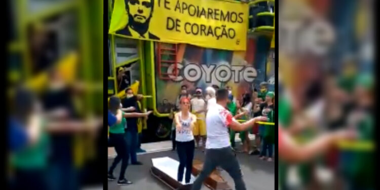 BRASÍLIA| Um grupo de Bolsonaristas decidiram fazer uma manifestação neste sábado (9), e dançaram em torno de um caixão, debochando das mais de 10 mil mortes pelo novo coronavírus. Os apoiadores do governo de Jair Bolsonaro (sem partido) dançaram thriller, canção de Michael Jackson, enquanto uma mulher saia de dentro de um caixão.