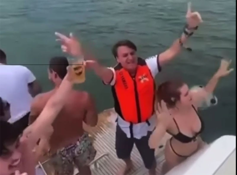 Bolsonaro dança funk ao lado de apoiadores. O presidente aparece contente, ao som do "funk do Bolsonaro", que faz uma paródia da música "baile de favela"; a canção ataca os opositores do mandatário com referências misóginas e homofóbicas.