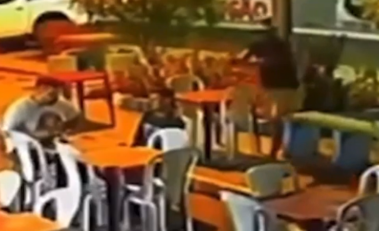 Nas imagens, Guilherme está de costas para a rua e está com uma pessoa. Ele não percebe quando dois homens numa moto estacionam do outro lado da rua.