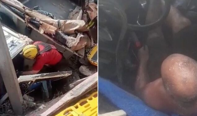 Vídeos gravados por moradores da região mostram o motorista preso dentro do veículo, esperando o resgate. Confira: