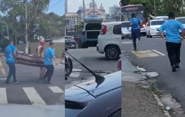 MANAUS – AM | Nesta segunda-feira (31), funcionários da funerária São Francisco passaram por momentos de tensão, ao precisarem “resgatar” um caixão que acabou caindo do carro funerário no meio de uma avenida em Manaus. O caso ocorreu na avenida Tefé, no bairro Cachoeirinha, zona Sul da cidade.
