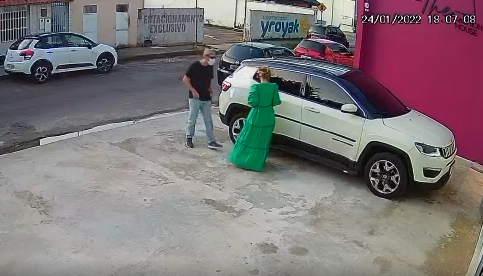 O homem, que aparece de máscara, um gorro e óculos escuros, aborda a vítima por volta das 18h. Ela tinha acabado de sair de uma loja e colocava as compras no veículo, um Jeep Compass modelo Palace, de placas QZT- 2N88 e cor branca.