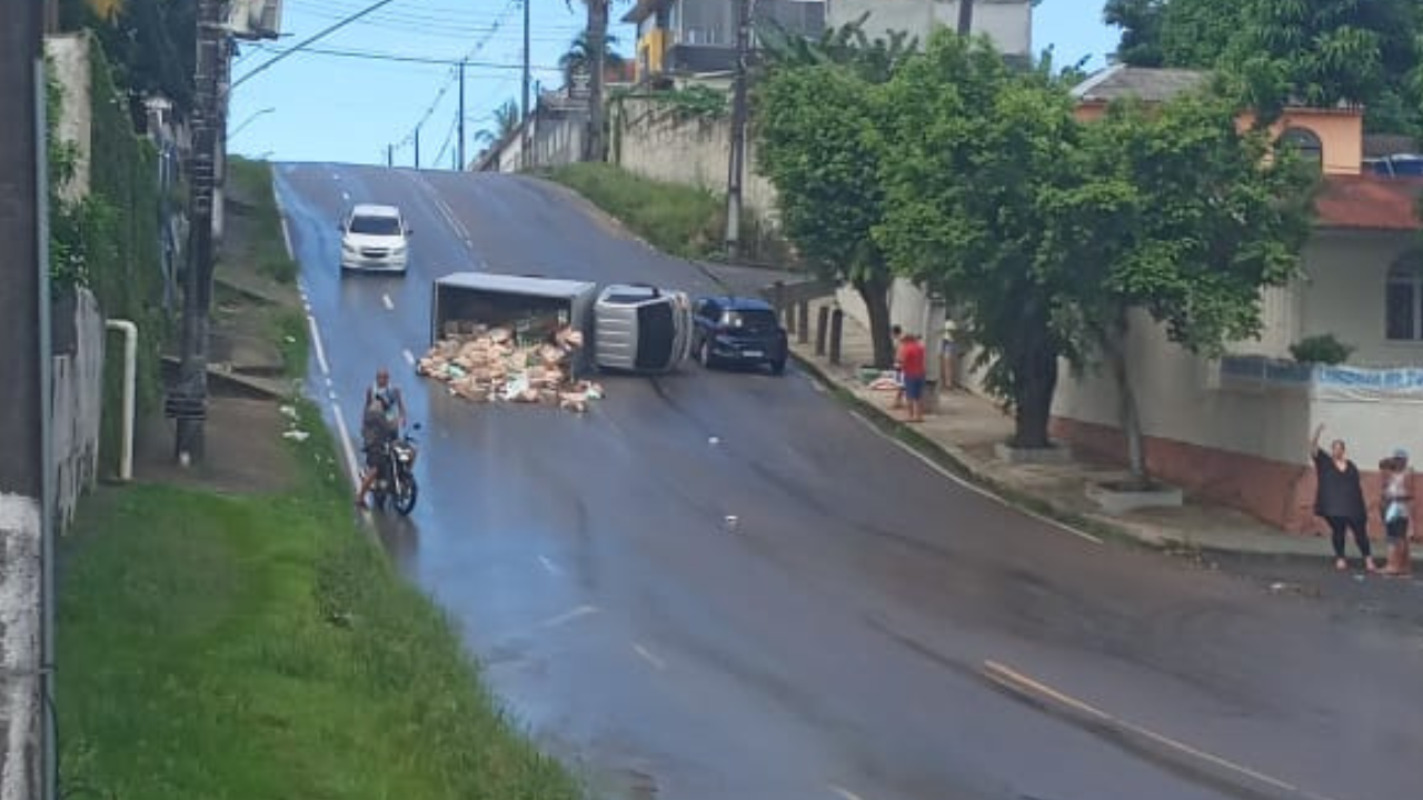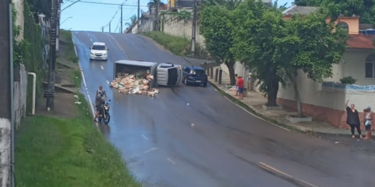 MANAUS (AM) – Uma caminhonete tombou na tarde desta segunda-feira (12), na avenida Dublim, bairro Planalto, zona Centro-Oeste. A carga transportada ficou toda espalhada na pista.