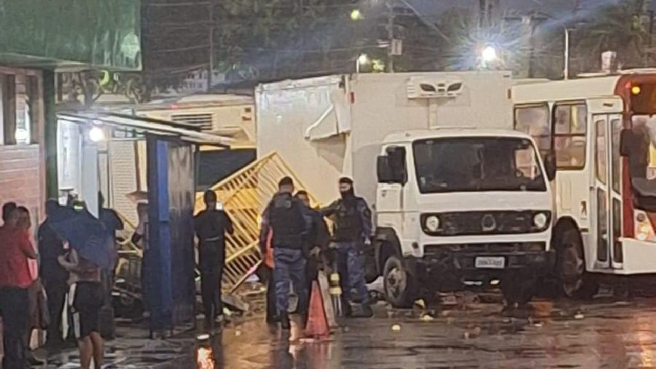 MANAUS (AM) – Na noite desta sexta-feira (19), um caminhão invadiu o Terminal 3 (T3), no bairro Cidade Nova, zona norte de Manaus, e causou danos em um muro e em três motos pertencentes a funcionários do local. O acidente também derrubou uma placa luminosa e atingiu um reservatório de tratamento de esgoto.