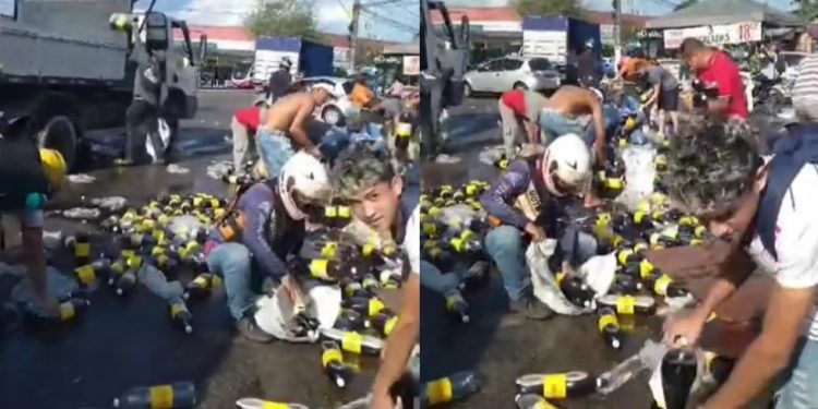 Saqueou a mercadoria e fez a festa. “A benção caiu aqui”, diz um homem no vídeo. Não se sabe quem era o dono da carga, mas o motorista nada poderia fazer.