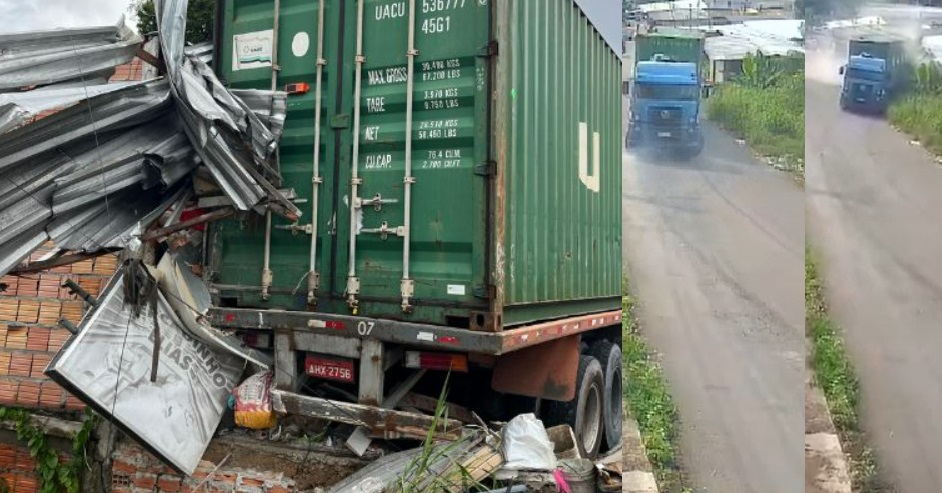 O acidente ocorreu na Rua Vasco de Ataíde e fica claro que a carreta desce sem controle e para apenas na casa. Uma a cadeirante, de 12 anos, e outro menino, de 5 anos, escaparam por pouco.