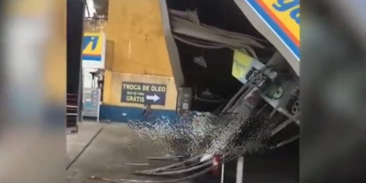 Até o momento, não há informações de feridos. O posto ficou destruído e o veículo atravessado na avenida.