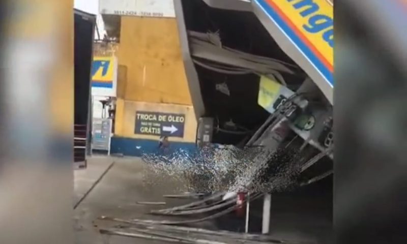 Até o momento, não há informações de feridos. O posto ficou destruído e o veículo atravessado na avenida.