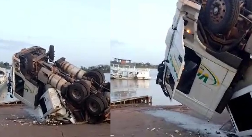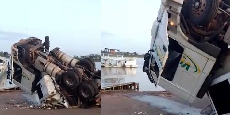 MANAUS – Uma carreta sem controle virou no Porto do Careiro da Várzea na manhã desta quinta-feira (21). Imagens de um celular mostram a cabine do veículo parcialmente destruída.